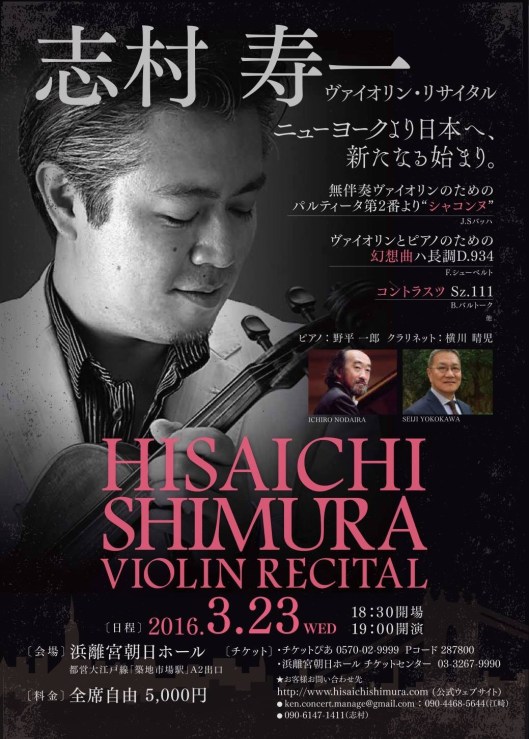 2016年を迎えてあっという間に1月も終わりにさしかかり、リサイタルの日まで2ヶ月を切りました。ここでのお知らせが遅くなってしまいましたが、3月23日 浜離宮朝日ホール(19時開演)においてヴァイオリン・リサイタルを行うことになりました。