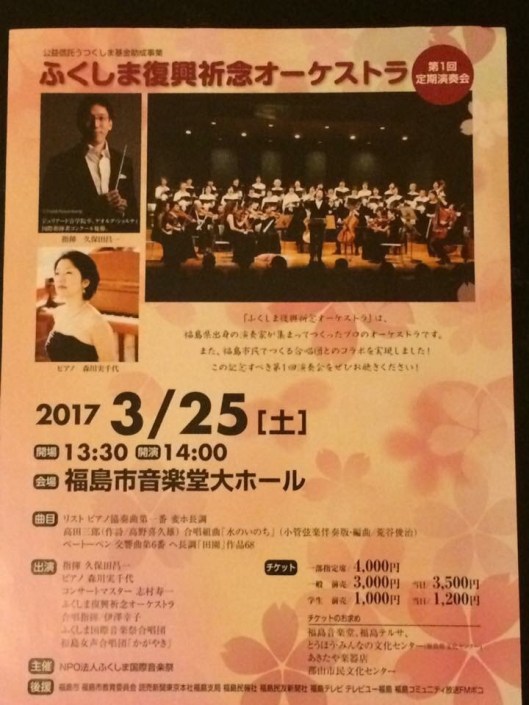 3/25(土) 福島市音楽堂大ホールにて行なわれた、ふくしま復興祈念オーケストラの第一回定期演奏会にコンサートマスターとして出演させて頂きました。これから徐々に地元に根付き、福島県の皆様に愛されるオーケストラに育っていくことを願っています。