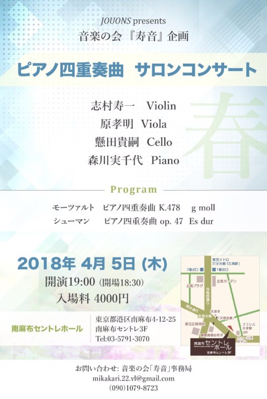 モーツァルトとシューマンによるピアノ四重奏コンサート”春”@南麻布 4/5 7:00pm 01 木曜日 3月 2018 Posted by vnshimura in Uncategorized ≈ コメントする 音楽の会「寿音」企画です。春の室内楽コンサートをいたします。ニューヨークで活躍中のピアニスト森川実千代さんと、日本の仲良し弦楽トリオの初共演です。なにせ作品が素晴らしいので!どうぞよろしくお願いいたします。