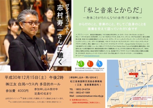 Matsue Musial International Association さんが素敵な企画をたてて下さいました。身体と音楽との関係からイタリアでの素晴らしい音楽体験まで、話の内容は盛りだくさんになりそうです。
