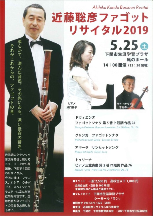 来週は下関にお邪魔してトゥリーナのピアノトリオを演奏します。ニューヨークのマネス音楽大学時代からの友人で、素晴らしいバスーン奏者の近藤聡彦さんのリサイタルです!